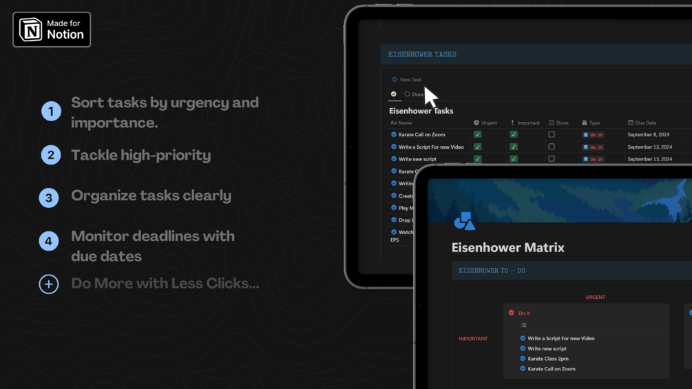 Take control of your tasks and time with our Eisenhower Matrix Notion Template, designed to help you prioritize and manage your workload efficiently. This template leverages the proven Eisenhower Matrix method, categorizing tasks into four key quadrants to ensure you focus on what truly matters.
